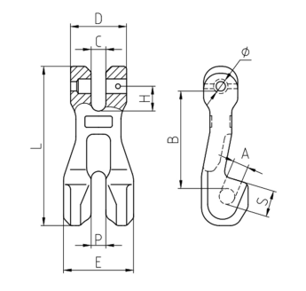 | Model No | Size (In) | WLL (Tons) | MBL (Tons) | Dimensions (mm) | N.W. (kg/pc) | |||||||||